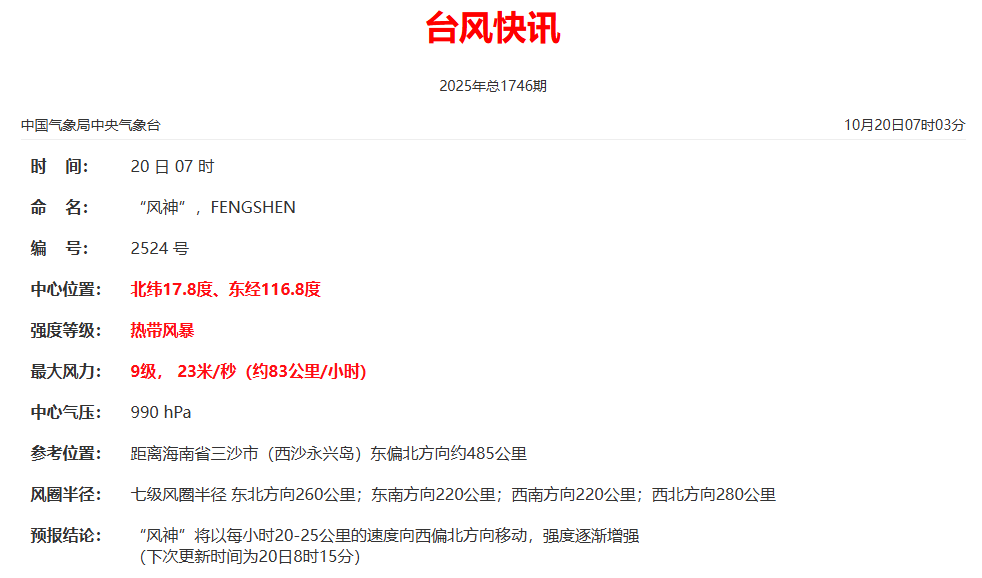 中央气象台将于10月20日6时继续发布台风蓝色预警。今天(20日)晚上7点,海南省三沙市(西沙永兴岛)东北约485公里处的南海中心,东经116.8度。中心附近最大风力9级(23米/秒),中心最低气压990hPa,7级风圈半径220-280公里。预计“风神”将以每小时20-25公里的速度向西北偏西方向移动,强度将逐渐增强。最强可达严重热带风暴级或台风级(30-35米/秒,11-12级)。 21日当天,受来自南方的冷空气影响,它将在南海中部和北部地区返回西南方向,向越南中部沿海移动,强度逐渐减弱。受冷空气共同影响和“风神”,20日8:00至21日08:00,台湾海峡、巴士海峡、南海北部和中部、东沙群岛、西沙群岛、中沙群岛及黄岩岛附近海域、北部湾、琼州海峡、华东西部、黄海、山东半岛渤海沿岸, 江苏沿海、上海沿海、长江口地区将有6~8级、阵风9~10级,杭州湾、浙江沿海、台湾沿海、福建沿海、沿海沿海将有阵风9~10级。东海西南部、台湾海峡、浙江南部沿海、福建沿海、广东东部沿海、华南北部部分地区有9~11级风、阵风11~13级。南方网广东考察记者 卢少聪