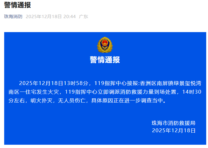 今天(12月18日)20时左右,广东省珠海市消防救援局发布预警:2025年12月18日13时58分,119指挥中心接到报警称,香洲区南屏区镇绿景西月湾南区一处住宅发生火灾。 119指挥中心立即派出消防救援力量赶赴现场处置。 14时30分左右,明火被扑灭,无人死亡。具体原因正在进一步调查中。